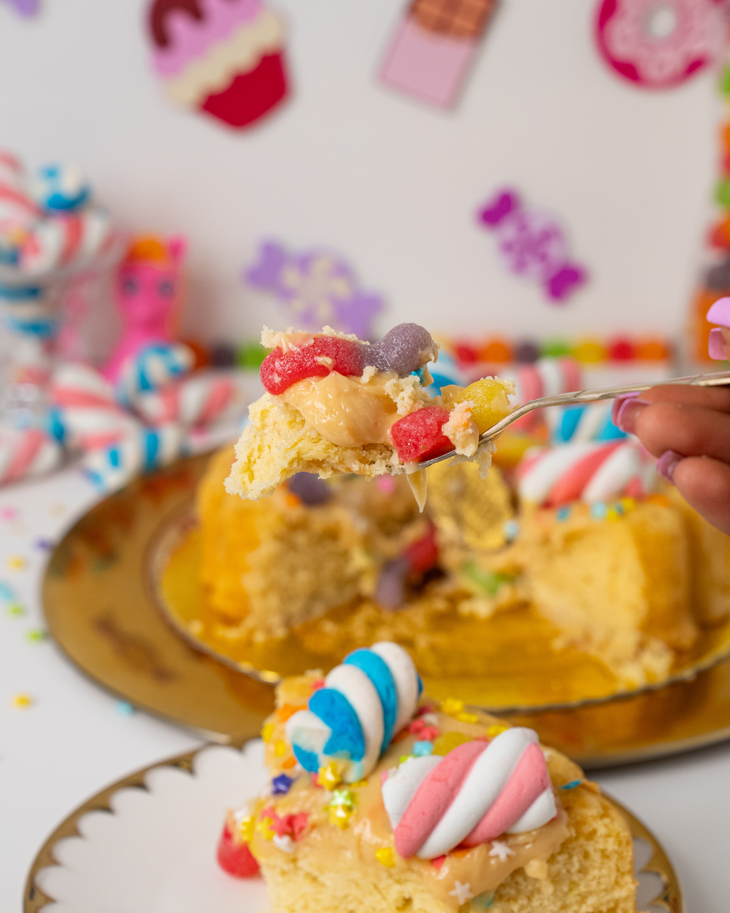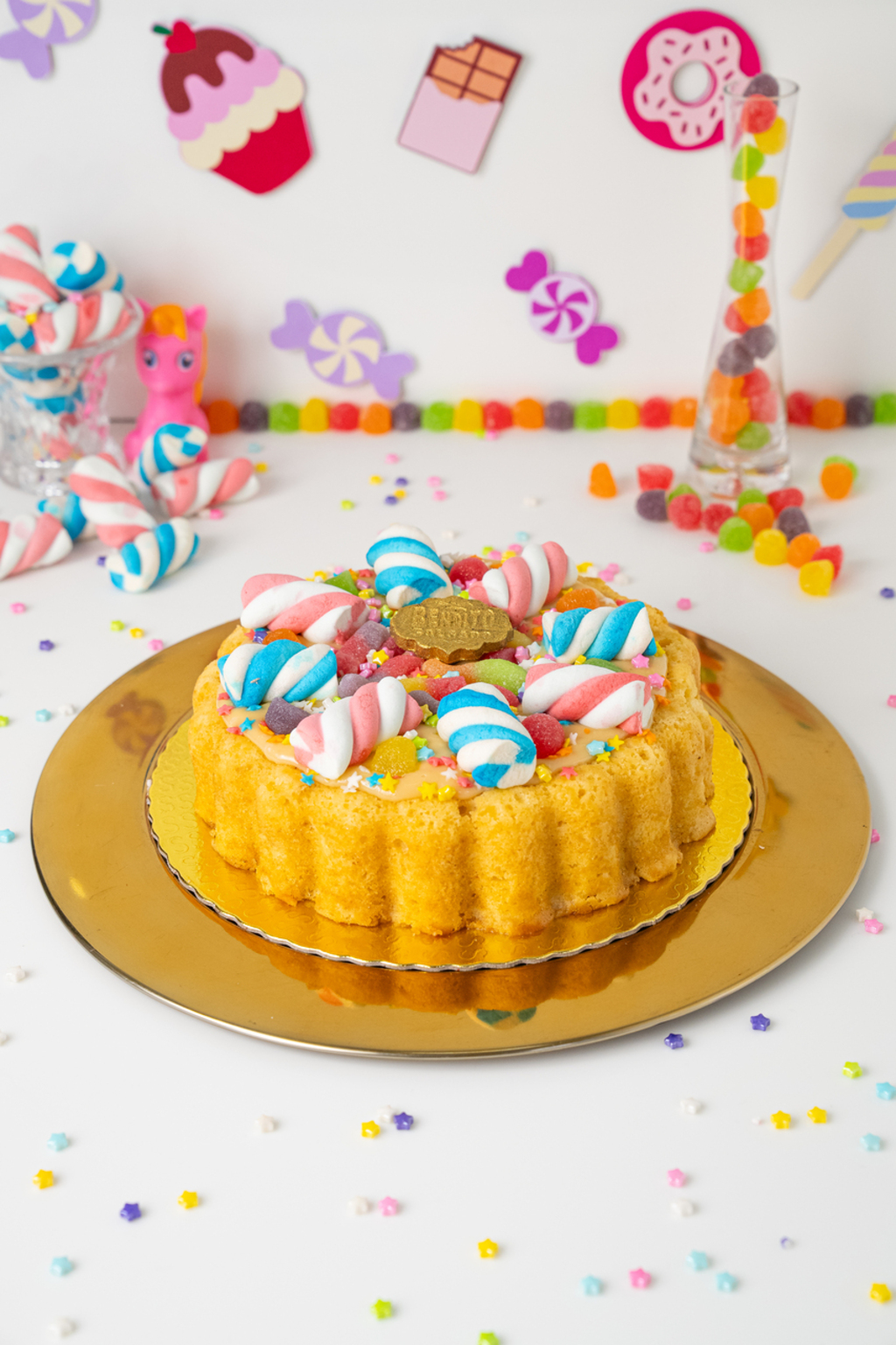 Nossa deliciosa massa fofinha de Baunilha com cobertura de brigadeiro gourmet branco e muitas guloseimas.