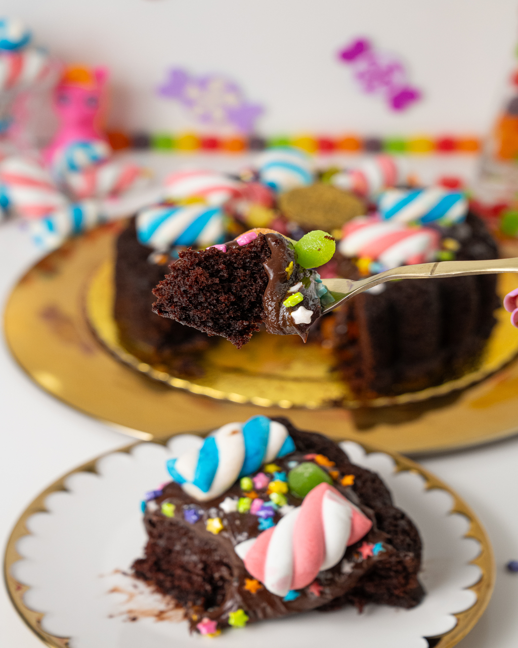 Nossa deliciosa massa fofinha de chocolate com cobertura de brigadeiro gourmet ao leite e muitas guloseimas.