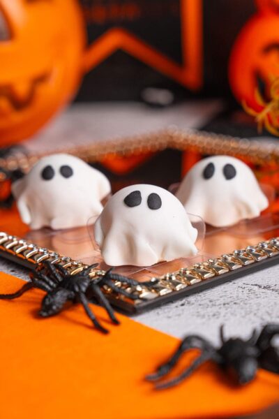 Cápsula de Chocolate Nobre Branco recheada com Brigadeiro Gourmet de limão e cobertura de chocolate branco com decoração de pasta americana em formato de Fantasma.