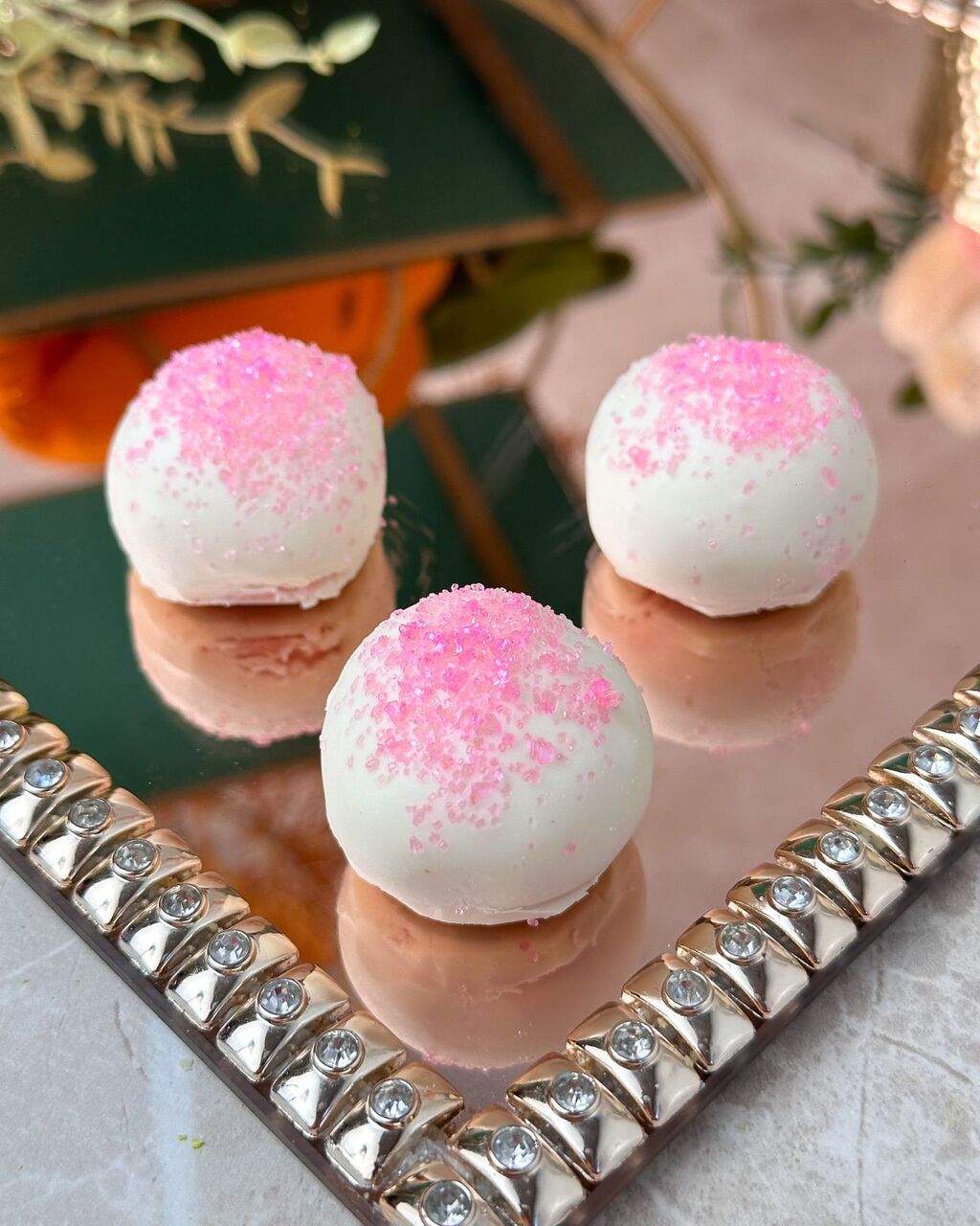 Nosso delicioso Brigadeiro Moranguinho com cobertura de Chocolate Branco, salpicado com açúcar.
