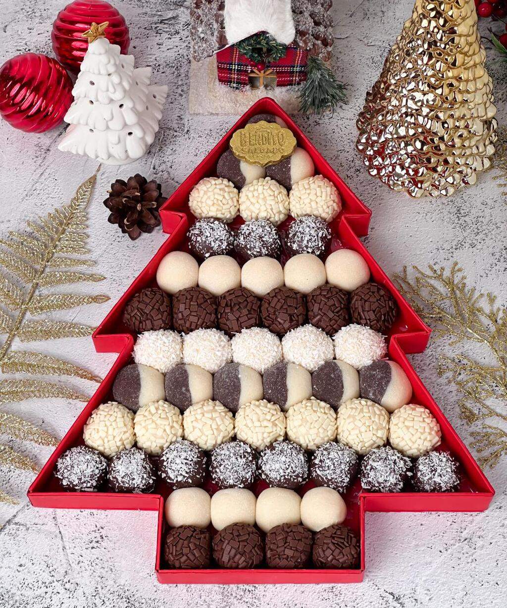 Uma Box Luxo Cartonada em formato de árvore de Natal com 55 docinhos variados. Presente ENCANTADOR e que vai ser um sucesso!! Super elegante!