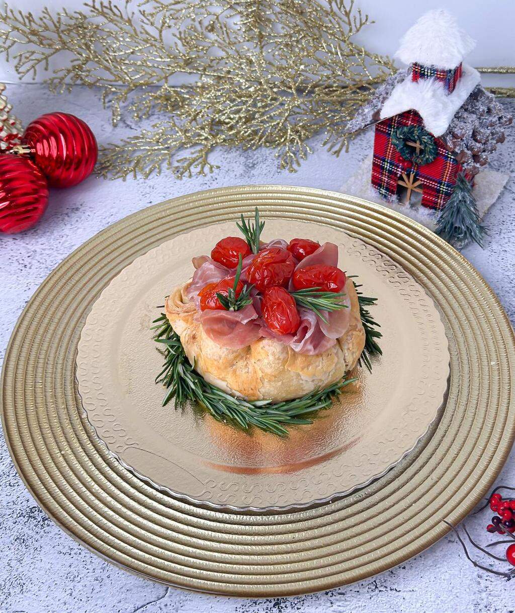 Maravilhoso Queijo Brie coberto com uma massa folhada, decorada com tomates confitados e presunto parma. Um sabor super elegante e sofisticado. Serve 6 a 8 pessoas