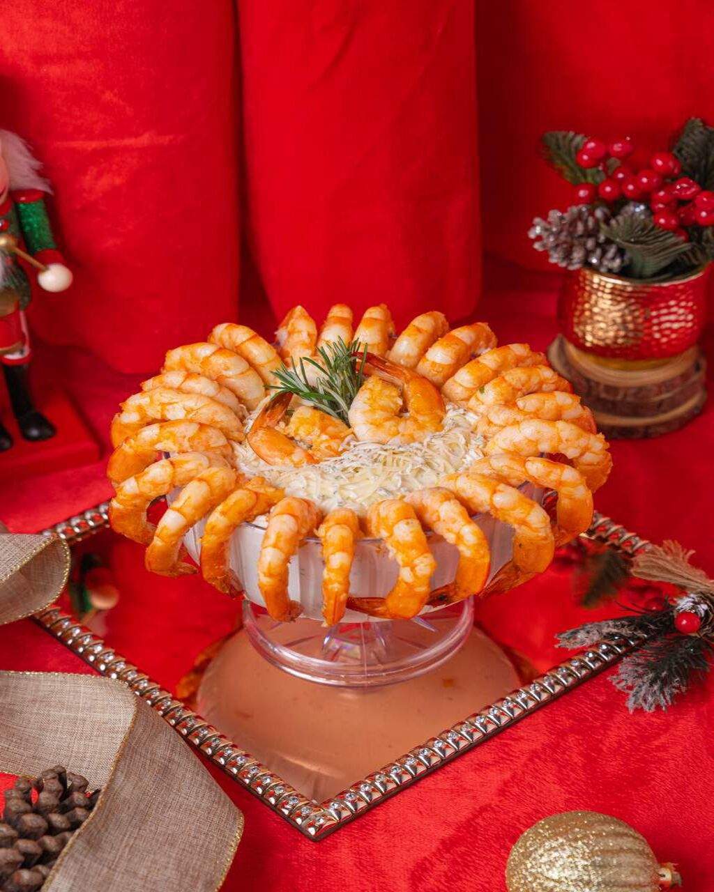 Uma chuva de camarões poderia ser o nome dele, nosso maravilhoso molho de gorgonzola com camarões grelhados lindamente decorado para elevar o nível da mesa Natalina. * Serve 12 a 15 pessoas