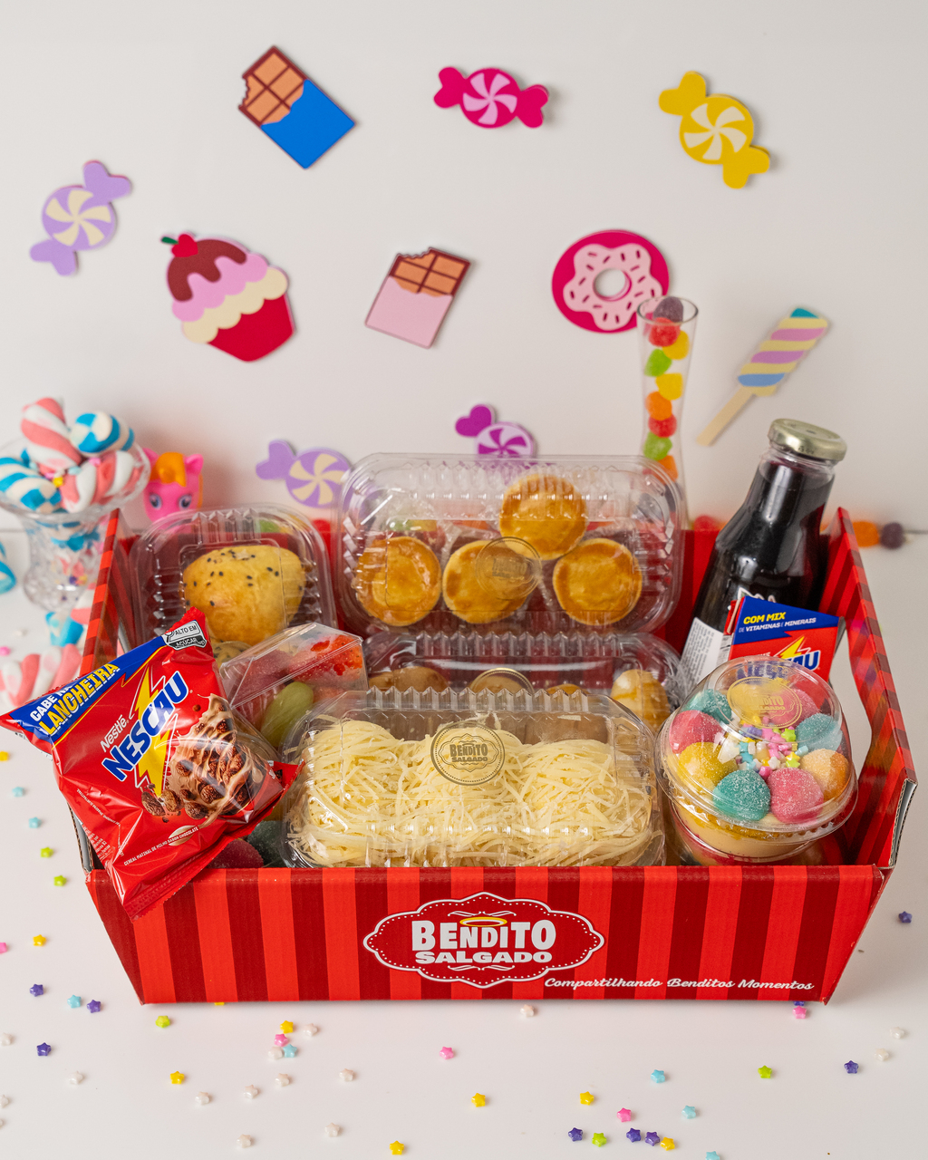 Ela vem com 4 enroladinhos de presunto com catupiry, 3 pãezinhos de Queijo Tradicionais, 3 pãezinhos sem recheio, 4 empada de frango, 4 esfirras de carne, 1 mix de fruta (morango e uva), 2 bolos de pote infantil, 1 suco de uva premium, 1 Nescau cereal de bolinhas, e 1 Nescau de caixinha.