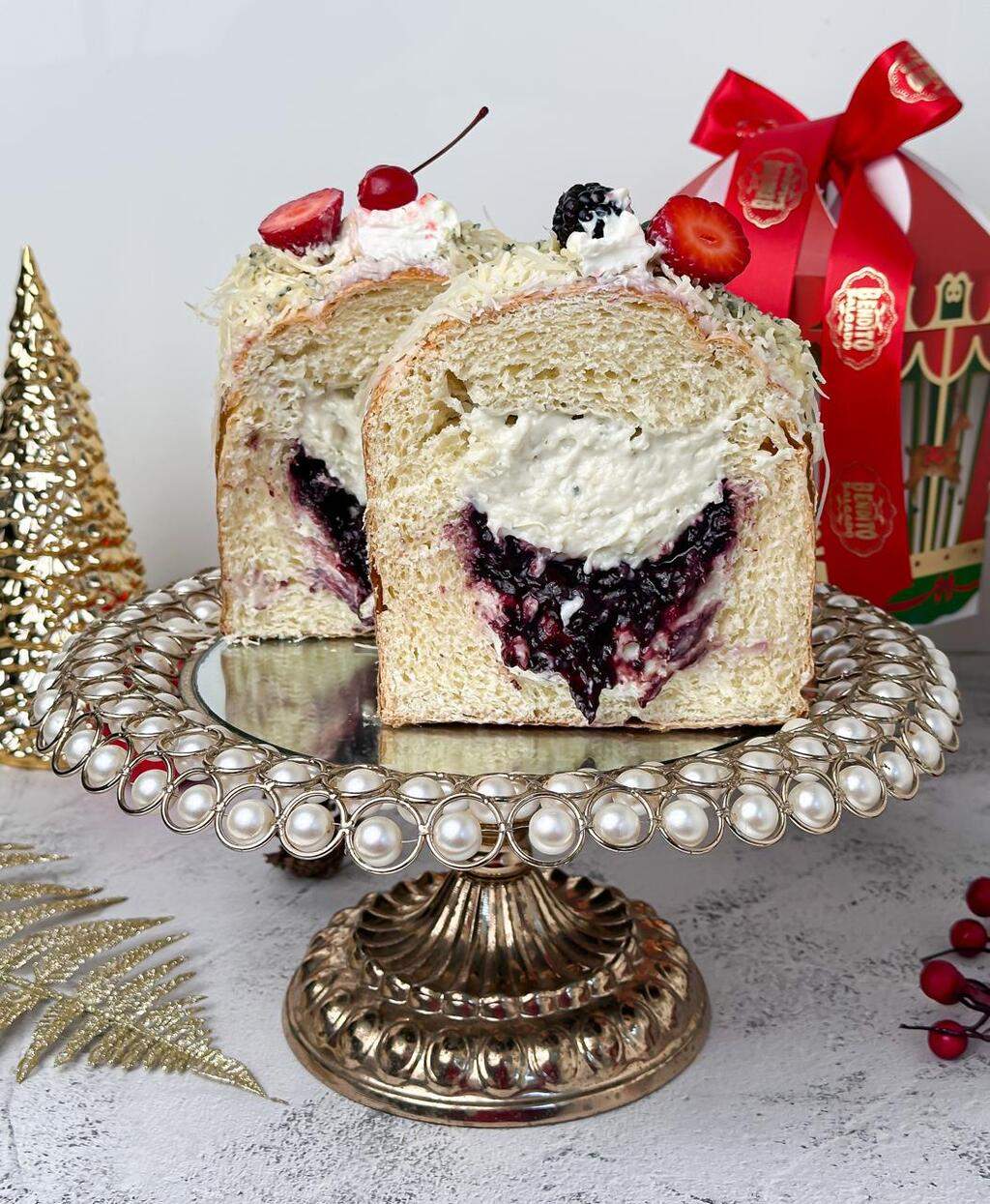 Nosso Chocotone Premium Artesanal e ZERADO de essências artificiais, feito com essência de fabricação própria, 100% natural, com ingredientes premium e sem conservantes, ricamente recheado com Brigadeiro Gourmet Cremoso de Gorgonzola e Geleia Artesanal de Frutas Vermelhas, decorado com Morangos Glaceados e Berries Secas.