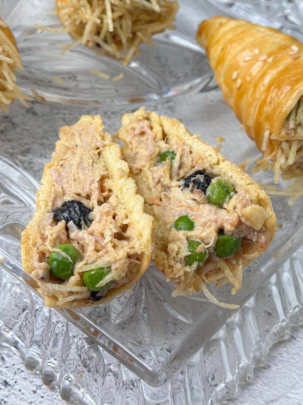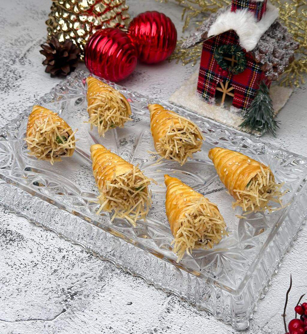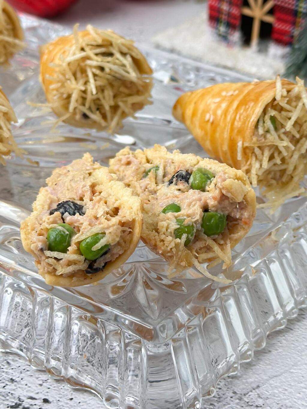 Nosso maravilhoso Cone de massa especial, assada com recheio Cremoso de Salpicão de Frango, coberto com Catupiry e Batata Palha. Um arraso, elegante e super combina para o Natal!