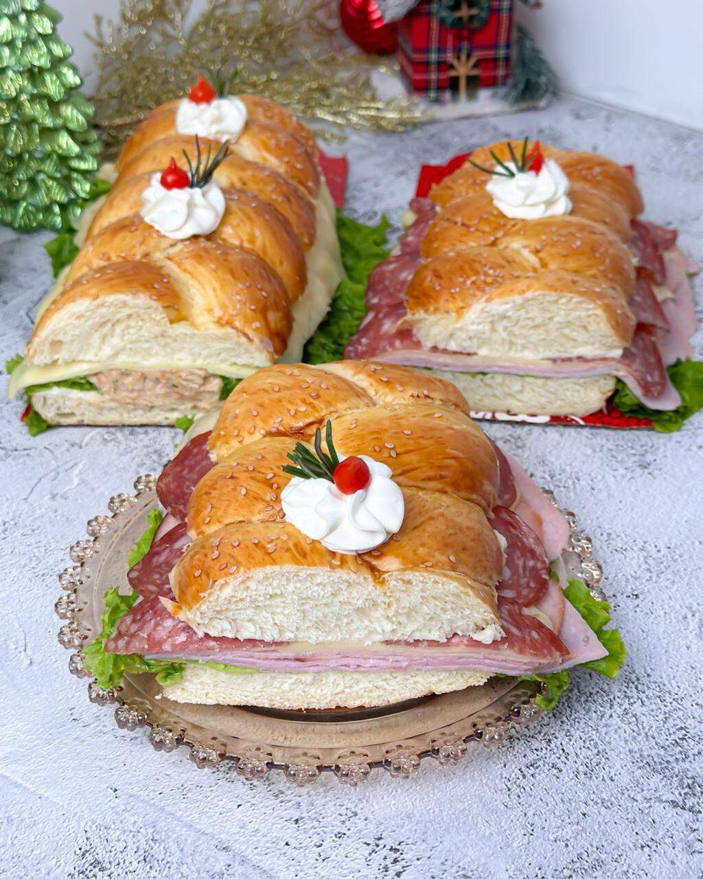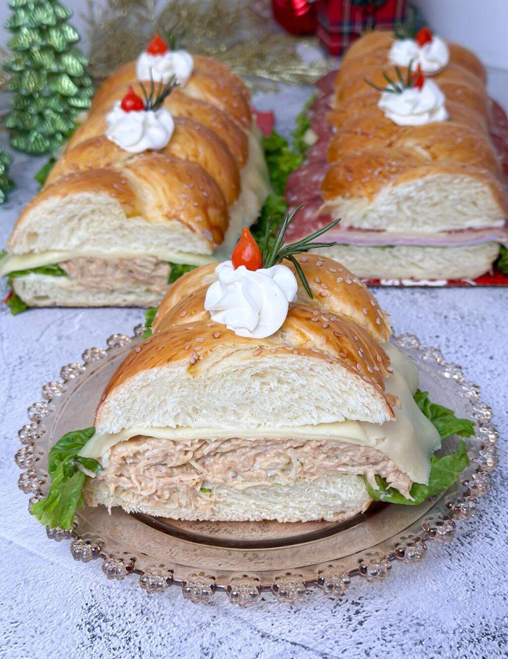 Delicioso pão metro fofinho com receita especial caseira recheado a metade com recheio cremoso especial de frango e a outra metade com frios finalizado com tomates cereja e creme de queijo.